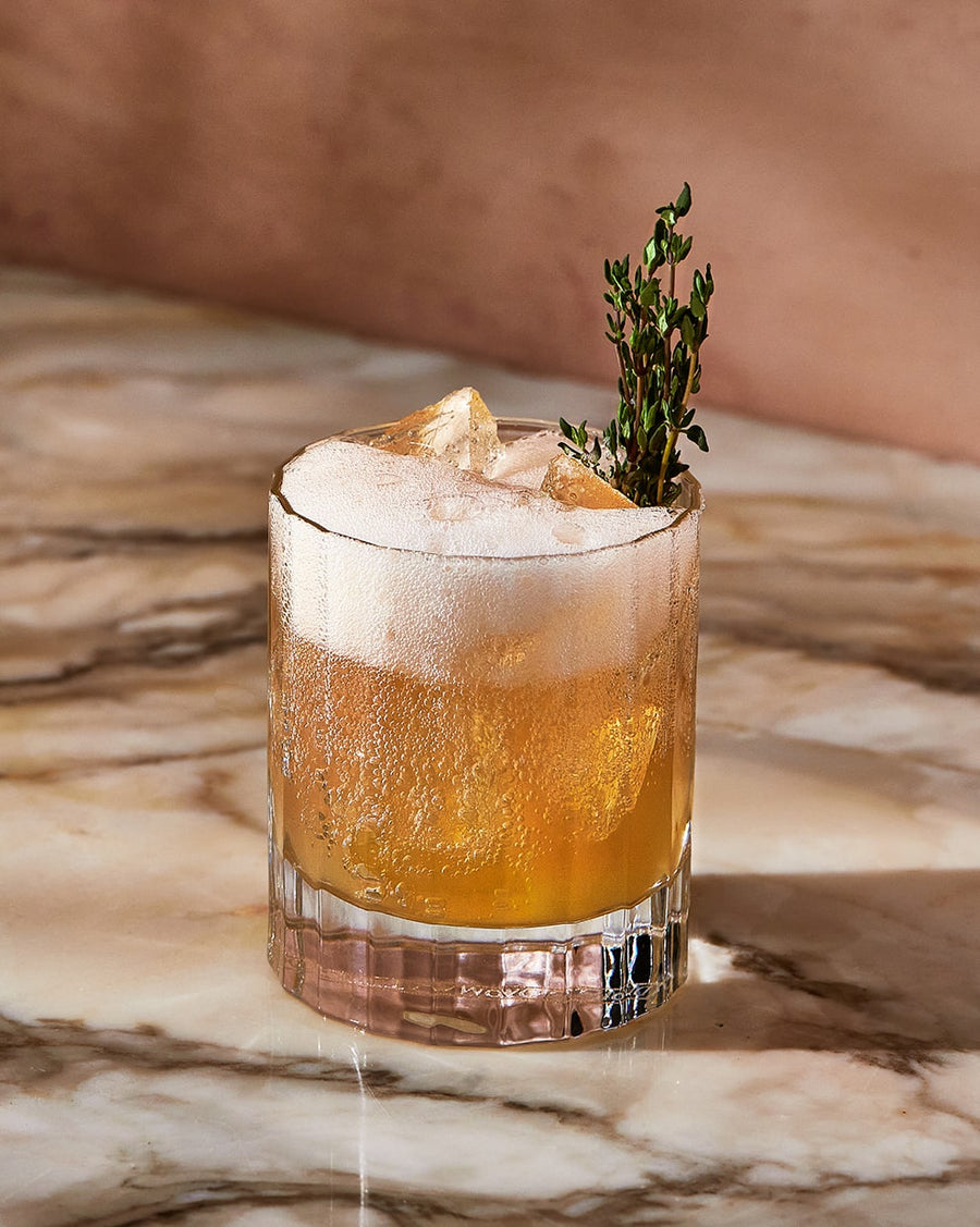 Bring it all together in a lowball glass over ice. Stir gently and garnish with thyme sprig.